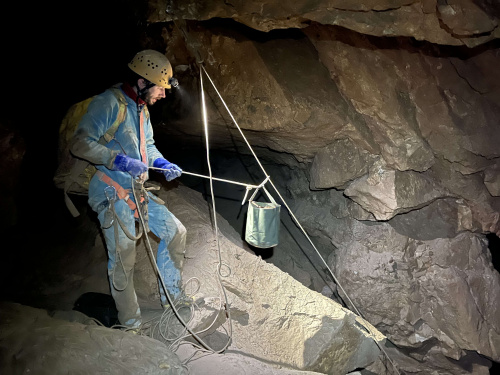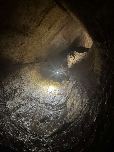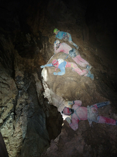 So ging es dann am nächsten Morgen für 5 Höhlenforscher*innen, trotz optimiertem Packen, mit 5 schweren Schleifsäcken los. Der für einige schon sehr gewohnte Weg zum Sprengstellenbiwak dauerte dann für Ungeübte mit den schweren Säcken doch etwas länger. Daher entschieden wir uns dann kurz nach dem Sprengstellenbiwak wieder zu diesem zurück zu kehren und die erste Nacht dort zu verbringen. Den so frei gewordenen Abend verbrachten wir mit einem Besuch in die Endhallen. Diese Weisen wunderschöne Lehmformationen auf, haben aber eher wenig Neulandpotential und sind daher selten besucht.