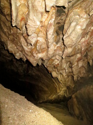 Roland H. erreicht nach ca. 30m über einen immer niedriger werdenden Schichtfugengang eine Senke, die mit dunkelgrauem Lehm gefüllt ist. Die Decke senkt sich dort bis zum Boden - offensichtlich ist hier das Gangende erreicht. Senkrecht zu diesem Schichtfugengang schließt oberhalb des Standplatzes ein weiterer Gang an. Dieser bricht jedoch nach wenigen Metern steil ab und mündet in ein Fenster an einem Überhang, das in Richtung weiterer Gangverlauf des Dark Highway weist, wie wir durch Ruf- und Lichtverbindung feststellen. Roland K. folgt über die Querung, wobei er alle dortigen Sicherungen ausbaut - denn der finale Standpunkt kann ja nun viel leichter direkt per Seilaufstieg erreicht werden. Er erkundet ebenfalls nochmal den Schichtfugengang, wobei er am Ende der Senke eine gerade schliefbare Fortsetzung entdeckt, durch die ich nachfolge. Die Schlufstrecke ist nur kurz, die Decke hebt sich bald wieder und über eine Halde aus feinem, länglich bis runden Rollkies geht es unter gerade noch gangbarer Neigung weiter auf allen Vieren nach oben, an einem wunderschönen Marmorband vorbei bis zu einem mehrere Meter hohen Raum. Dessen rechte Deckenseite besteht aus massivem, teils dekorativ ausgewaschenen (gekolkten) Fels (Foto). Vom Zustieg her links oben wird der Raum hingegen von einem großblockigem Verbruch verschlossen, der an mindestens zwei Stellen schlufbare Fortsetzungen besitzt. Roland H. bekriecht diese zwar jeweils einige Meter weit, kehrt dann aber auf Grund der engen Situation im Verbruch um, ohne das schlufbare Ende dieser teils verzweigenden Gänge erreicht zu haben. Dann lockt noch eine größere Öffnung im vorderen Teil des großen Raums, die schlotartig im Verbruch nach oben führt. Nach wenigen Metern gibt das Blockwerk dort einen horizontalen Durchschlupf frei, der in einen großen, hallenartigen Raum mündet, durch den augenscheinlich einer der Hauptwege verläuft. Nach dem dort in aller Eile von Roland H. aufgestellten Steinmandl suchen wir allerdings auf unserem Rückweg zum Biwak vergeblich. Die Klärung bringt erst ein Abstecher zum Neuland einen Tag später: Der Durchschlupf mündet in den obersten Teil des Dark Highway, wie wir Dank dem scharfen Blick von Edu feststellen, der das Steinmandl links vom Hauptweg im Dark Highway entdeckt. Wir haben somit eine Art Bypass zum Hauptgangverlauf in diesem Abschnitt der Höhle erschlossen. Der aktuell noch mit 3 Ankern gesicherte Seilaufstieg kann somit bei einer der nächsten Touren - z.B. im Rahmen der noch ausstehenden Vermessung - wieder ausgebaut werden.