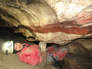 Während Michi unten mit dem Zeichnen begann, stieg Edu das Seil hoch. Schon nach wenigen Metern fanden wir einen kleinen Abzweiger, den Stajgr vermutlich übersehen hatte. Edu konnte ihn frei kletternd erreichen und verschwand zur Erkundung. Es handelt sich dabei um einen horizontalen Kriechgang weg vom Schlot. Schon nach wenigen Metern im Gang hörte Edu die Bohrmaschine von Stajgr. Der Gang mündet tatsächlich in dem Schlot, den Stajgr zeitgleich an diesem Tag bearbeitete.