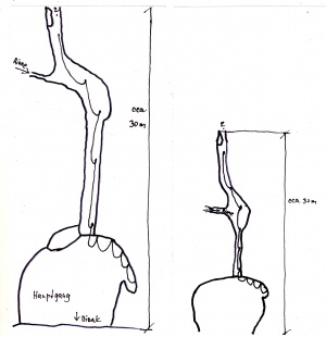 An der Wasserstelle ist es erstaunlich trocken und so kann ich mich etwas besser umsehen. Dabei fällt mir auf, dass das Wasser nicht aus einer Spalte sondern aus einem befahrbaren Schlot kommt. Schnell rufe ich Stajgr. Sein nächstes Projekt?