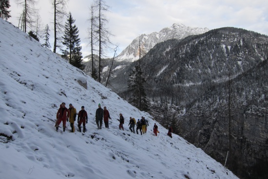 Ein kurzer Schönwettermoment zwischen zwei Regenfronten bescherte uns einen trockenen Zustieg zum Eingang. Es lagen nur wenige Zentimeter Nauschnee, so ging der Aufstieg mühelos voran. Bereits um 9:45 hatten alle Teilnehmer die Jausenhalle erreicht.